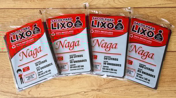 É nossa principal categoria de SACOS NAGA, sendo o nosso produto mais vendido. É o clássico saco de lixo preto 100% reciclado.
